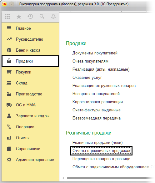 Если нужно отразить продажи в розницу, то используется документ с соответствующим названием из раздела "Продажи-Розничные".