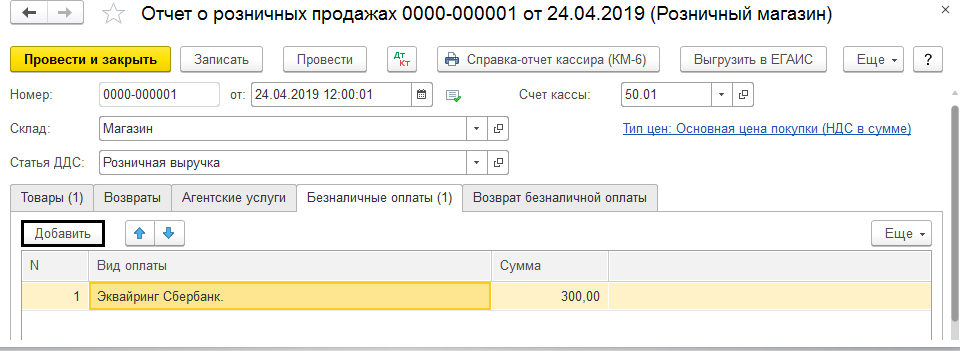 Чтобы отметился именно факт оплаты платёжной картой, нужно заполнение закладки с названием "Безналичные оплаты", отметив оплату картой.