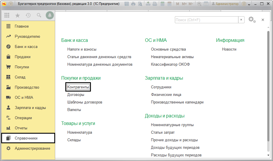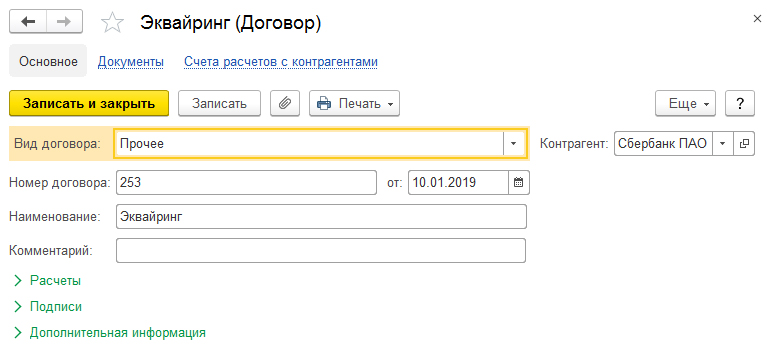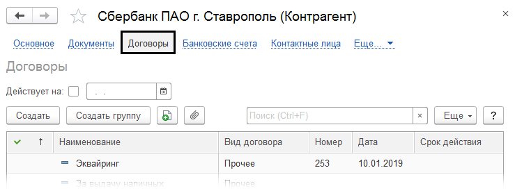 Предварительно также следует добавить и настроить банковский договор, можно, разумеется, реализовать задачу и при выполнении операций, но стоит рассмотреть этот шаг отдельно. В меню Контрагенты, Справочники, Покупки и продажи вносим данные договора.