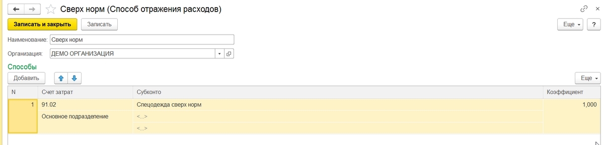 Следующим шагом станет внесение в категорию «Способ отражения расходов» еще одного пункта с расходами по спецодежде, используемой сверх нормы. В этом случае необходимо указать тип расходов, а затем снять галочку рядом с пунктом учитывать в налоговом учете.