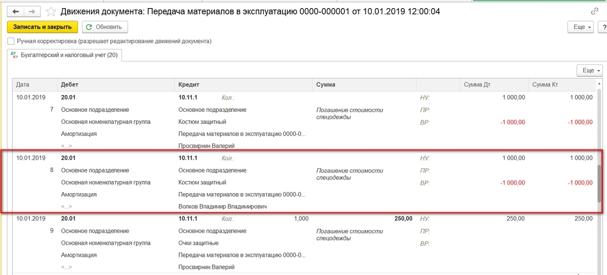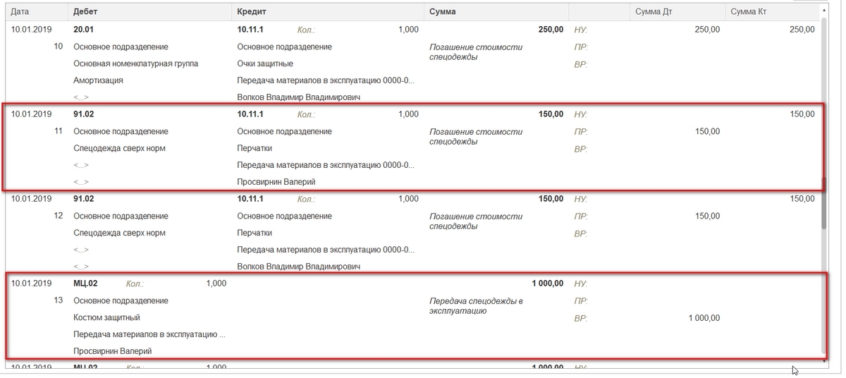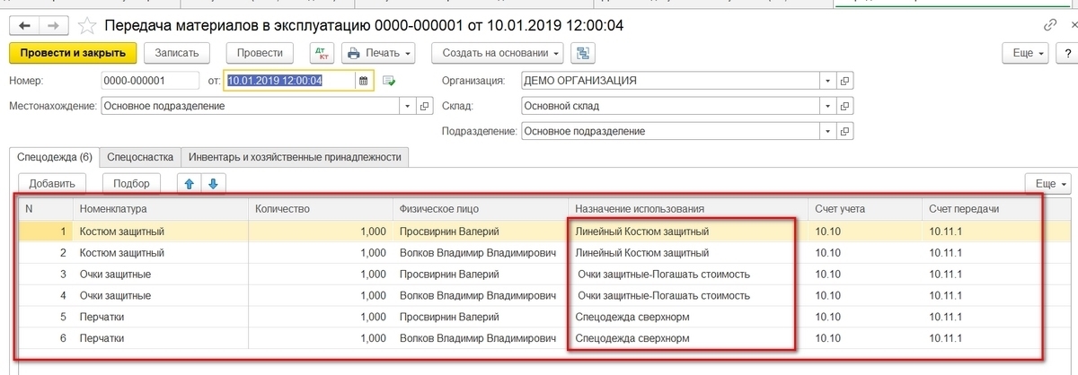 Система автоматически произведет возврат и спецодежда зачислится на счет 10.10. Затем останется только передать форму другому сотруднику, используя уже описанный алгоритм.
