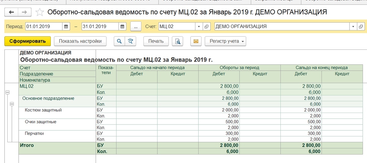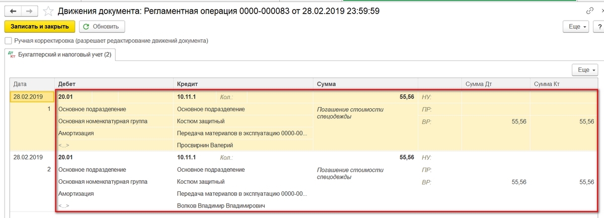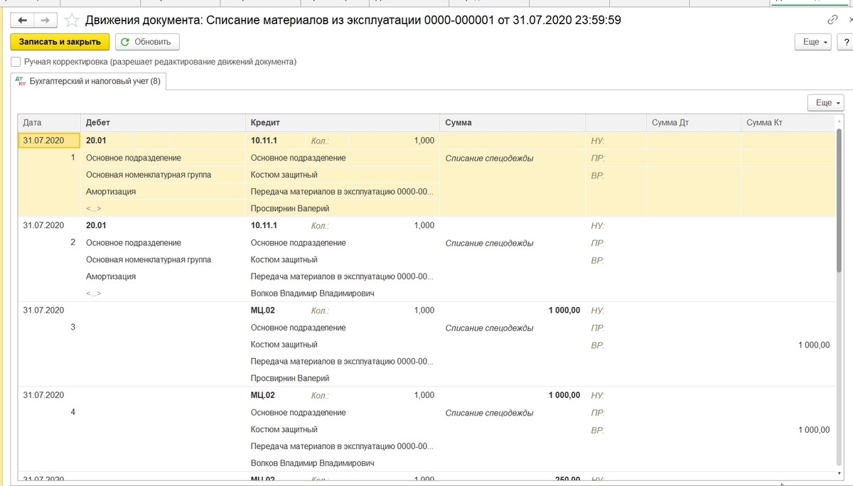 Карточки позволяют увидеть какой сотрудник получил спецформу, благодаря чему облегчается и упрощается контроль за материальными ценностями. При закрытии месяца фиксируется ОНО, составляющее 400 рублей, формируемое так: 2 000 рублей х 20%.