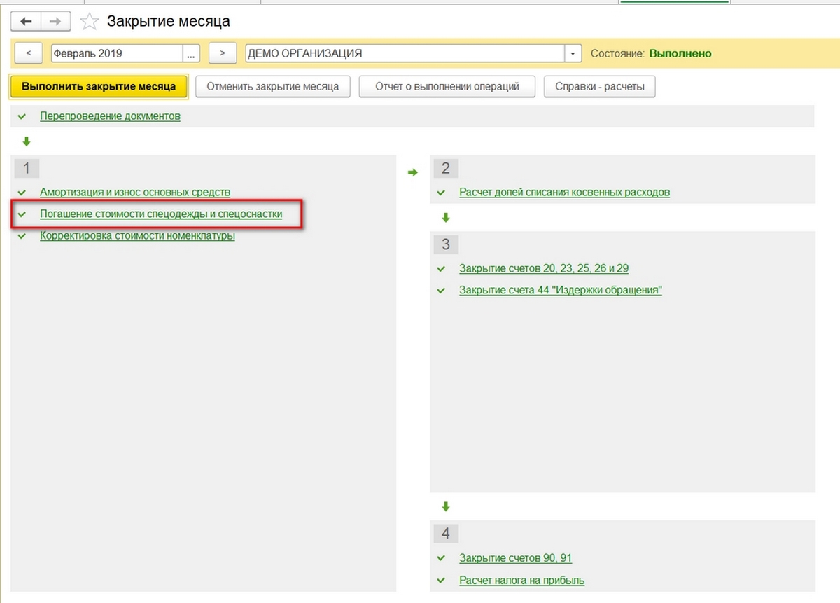 Рассмотрим как закрыть следующий месяц. Для этого откроем форму «Закрытие месяца». Теперь в этом меню появился пункт о необходимости погашения стоимости спецформы.