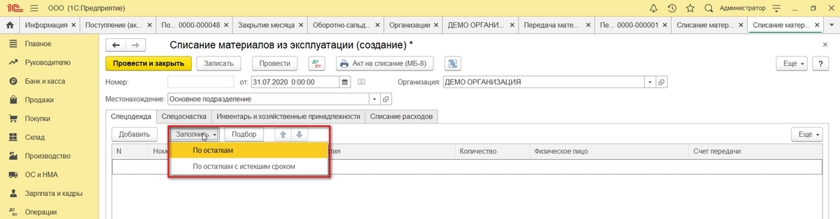 Ситуации, что сотрудник прекращает выполнять обязанности или переходит в другое подразделение и должен сдать числящуюся за ним одежду возникают регулярно. При этом сроки амортизации униформы еще не истекли. В этом случае необходимо подготовить «Возврат материалов из эксплуатации». Удобным моментом станет возможность автоматического заполнения табличной части, выбрав меню «По остаткам». Затем останется только указать фамилии уволенных сотрудников.