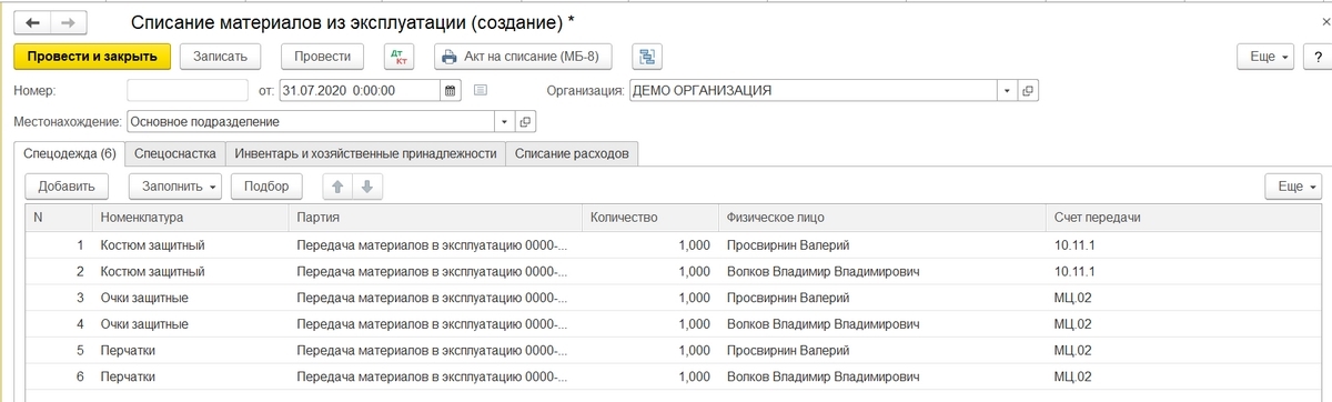 Облегчить заполнение документации позволяет создание документа «Списание материалов из эксплуатации». Форма создается на основании ранее полученных ведомостей о передаче предметов сотрудникам. Так очки и перчатки можно списывать уже после года эксплуатации. Однако чтобы показать наглядно проводку этого процесса отразим списание всех позиций в рамках одного базового документа.