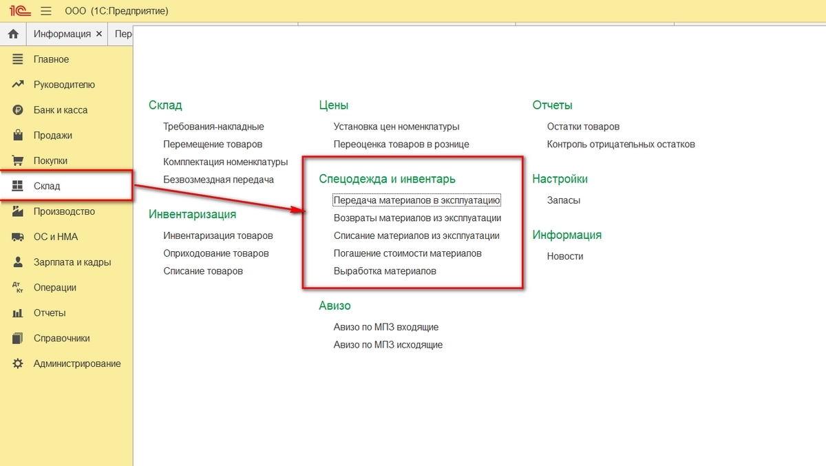 Оформление передачи спецодежды сотрудникам производится посредством перехода в нужный пункт меню. Для этого нужно открыть «Склад», выбрать «Спецодежду и инвентарь» и перейти к пункту «Передача материалов в эксплуатацию». Как это проводится показано на рисунке 4. В дальнейшем пункты меню и работа с ними будут рассмотрены подробнее.