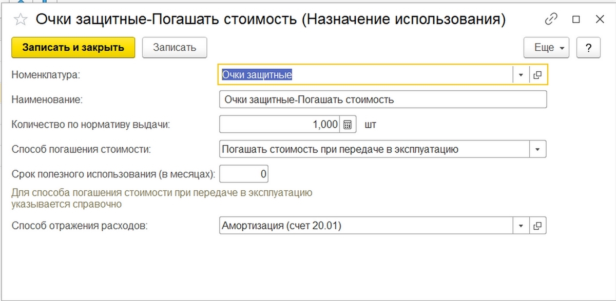 Для защитных очков необходимо выбирать другой способ погашения стоимости. В этом случае используется вариант «при передаче в эксплуатацию».