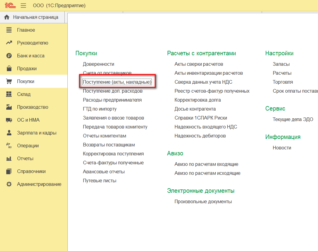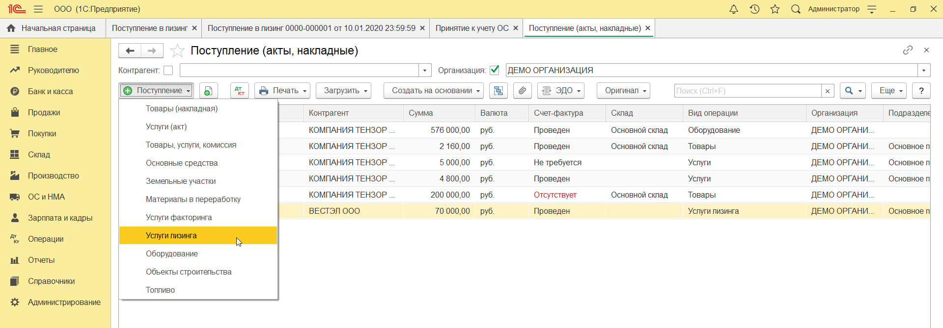 На лизинговые услуги лизингодатель может каждый месяц выставлять счет-фактуру. Чтобы отражать эти услуги, зайдите в меню «Покупки» и найдите «Поступление (акты, накладные)», кликните по нему. В результате этих действий должно открыться окно для создания акта.
