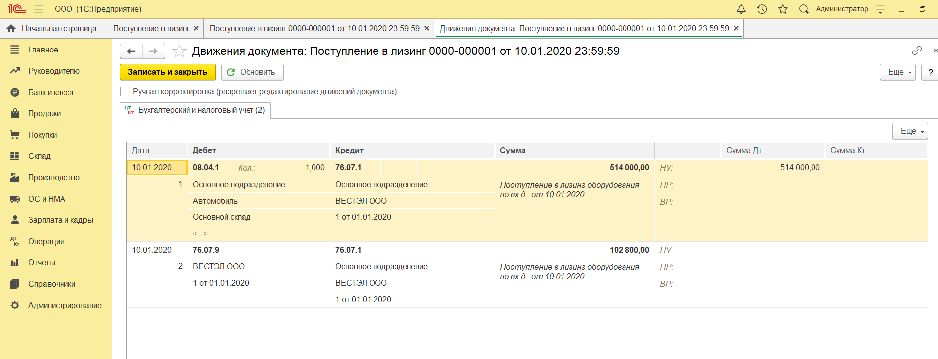 Когда данные введены, нажмите «Провести». Теперь в бухучете и налоговом учете находятся записи по расходам на услуги лизинга. Чтобы посмотреть проводки по расходам, нажмите ДтКт и проверьте получившиеся проводки.