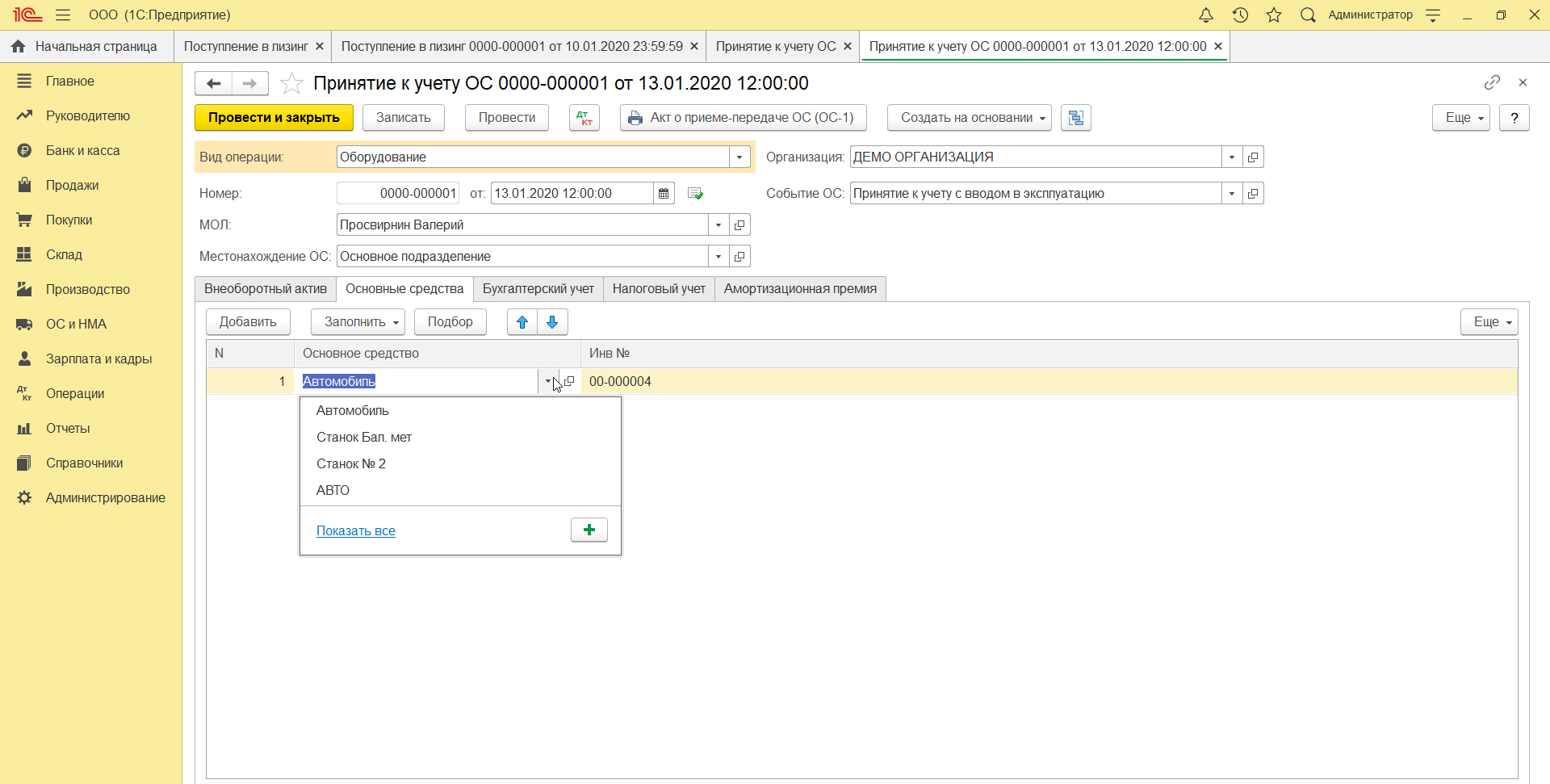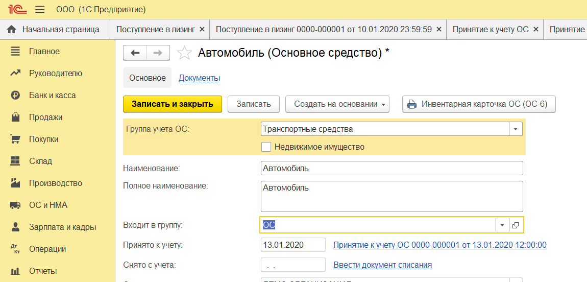 После заполнения нажмите «Записать и закрыть». Когда в справочнике появилось основное средство, можно продолжать заполнение, выбрав новое ОС. Инвентарный номер присваивается автоматически.