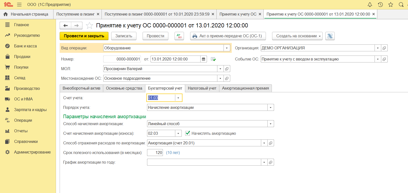 Оборудование, купленное в лизинг, не является собственностью организации-лизингополучателя, однако его все равно необходимо ставить на учет и амортизировать. Амортизацию можно начислить автоматом, воспользовавшись помощником «Закрытие месяца». Она также начисляется в меню ОС и НМА документом «Амортизация и износ ОС».