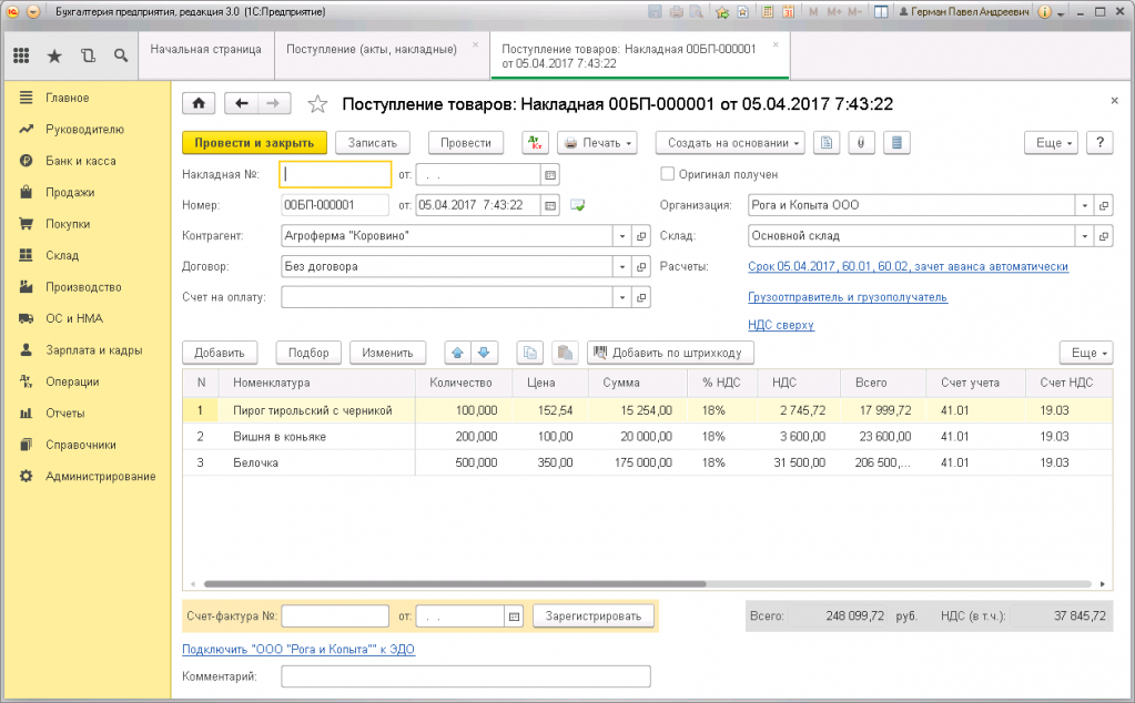 Итак, поступление товаров регистрируется в программной вкладке «Поступление товаров и услуг». Что потребуется для регистрации: