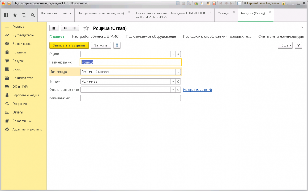 • в поле «Склад» указывается тип склада. Это могут быть стандартные «виртуальные» позиции, как «Оптовый склад» или «Основной склад», так и собственные места хранения;
