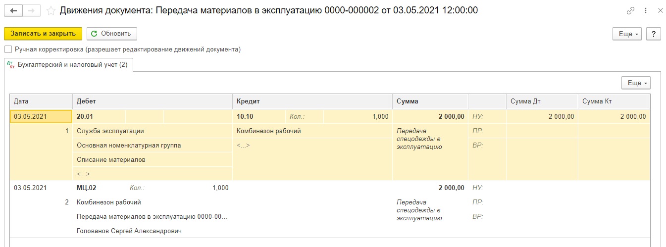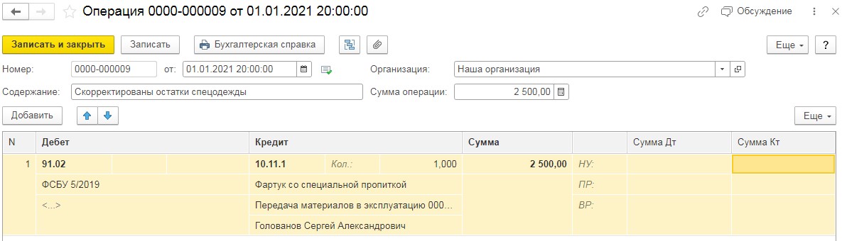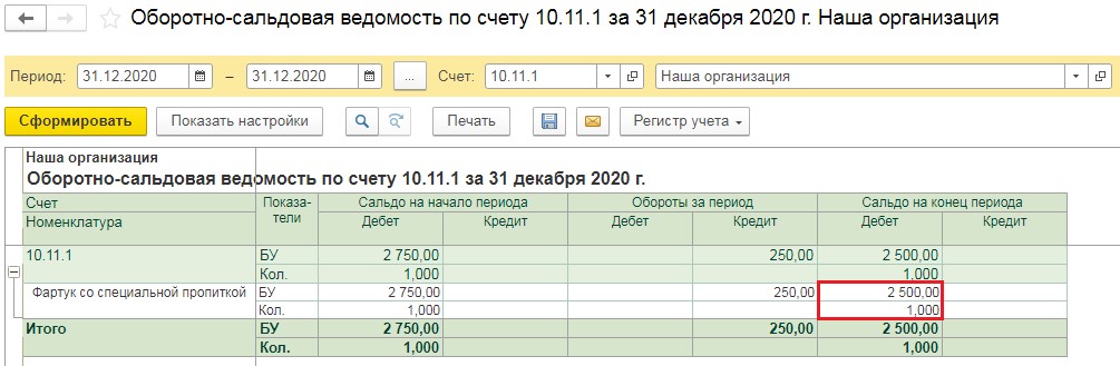 Из отчёта на рисунке выше видно, что был приобретён фартук со специальной пропиткой, на что потрачено 2 750 рублей. Стоимость спецодежды должна была признаваться в составе затрат ежемесячно. Один раз такое списание состоялось, так что на 1 января 2021 года остаток был равен 2 500 рублей.