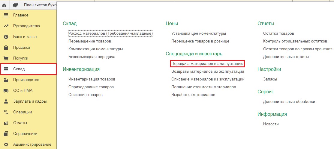 После этого спецодежда должна быть передана сотрудникам, что нужно отразить в документе «Передача материалов в эксплуатацию». Вводится он либо на основании документа покупки, либо в разделе «Склад».