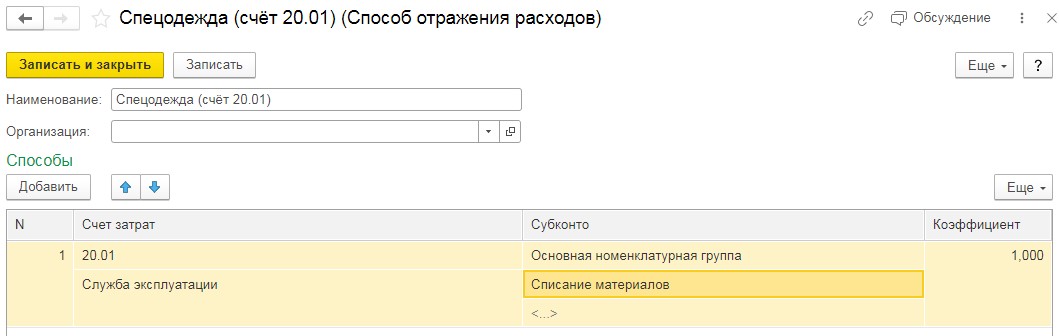 В документе «Передача материалов в эксплуатацию» заполнить следует вкладку «Спецодежда». В ней выберите приобретённый комбинезон, укажите количество и ответственное лицо. Обратите внимание на колонку «Способ отражения расходов» – в ней нужно ввести новый способ. Статья затрат – «Списание материалов», относятся они на счёт учёта производства.