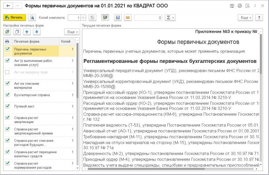 В данный список включены все первичные документы — как регламентированные законодательством (товарная накладная, кассовые ордера и др.), так и реализованные в 1С (справки-расчеты и пр.). Печатные формы документов, которые не установлены законодательством, имеют пометку в виде флажка в настройках печатных форм. Они в автоматическом режиме входят в Прил. № 3 при печати.