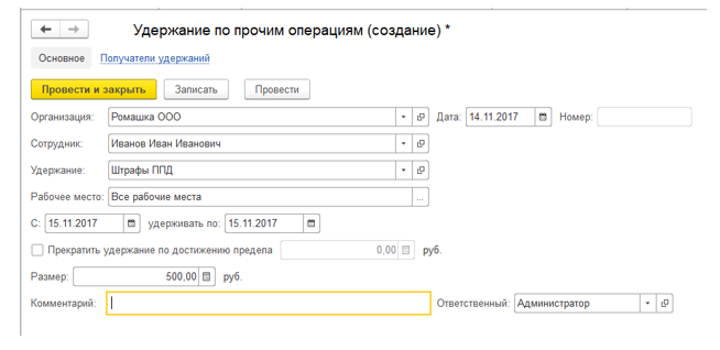 Размер штрафа вносим с использованием особого документа «Удержание по прочим операциям», который находится в «Зарплата» – «Удержания». В новый документ вносим компанию, работника, срок удержания, величину удержания.
