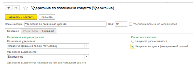 Перво-наперво производим настройку системы: Создаём новую составляющую в справочнике «Удержания». Заполняем новый элемент: «Наименование» – «Удержание по погашению кредита»; «Назначение удержания» – «Прочее удержание в пользу третьих лиц», «Удержание выполняется» – «Ежемесячно», «Расчет и показатели» – «Результат вводится фиксированной суммой».