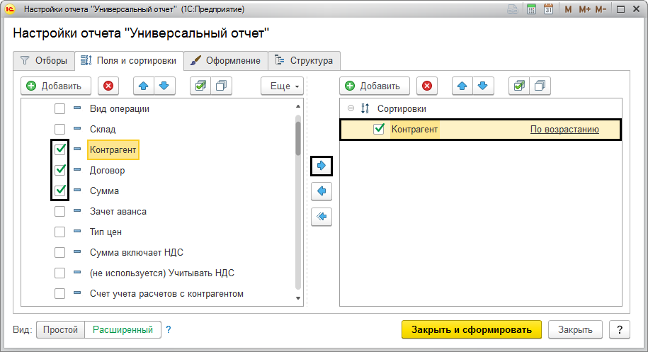 Сформированный отчет получился слишком объемным и содержит лишнюю для нас информацию в которой нет нужды. Для того чтобы задать более точные настройки, можно перейти на вкладку «Настройки...». В новом окне на вкладке «Поля и сортировки» мы можем выбирать поля, по которым формируется отчет. Убрав лишние пункты мы можем оставить только необходимое, в нашем случае – «Договор», «Контрагент» и «Сумма». С помощью голубой стрелки мы можем добавить любые пункты в правую окно и по этим пунктам будет производиться сортировка. В нашем примере мы хотим упорядочить наш отчет по полю «Контрагент» в порядке возрастания.