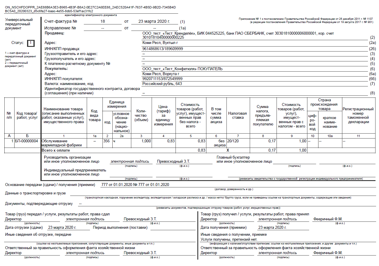 - Статус Первый. Применяется при использовании универсальных передаточных документов как первичной документации и счета-фактуры;