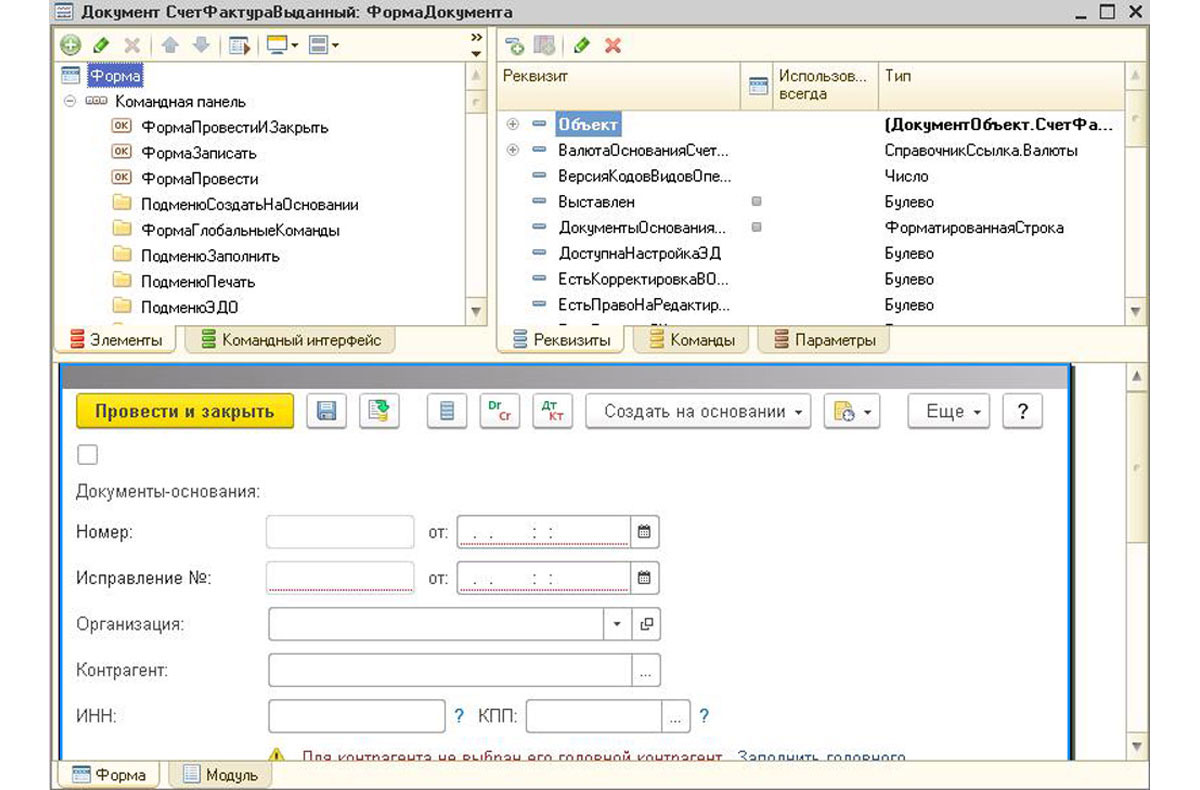 • Реквизиты формы. Справа сверху находятся сведения, с которыми функционирует форма. В них хранятся данные клиентской стороны.