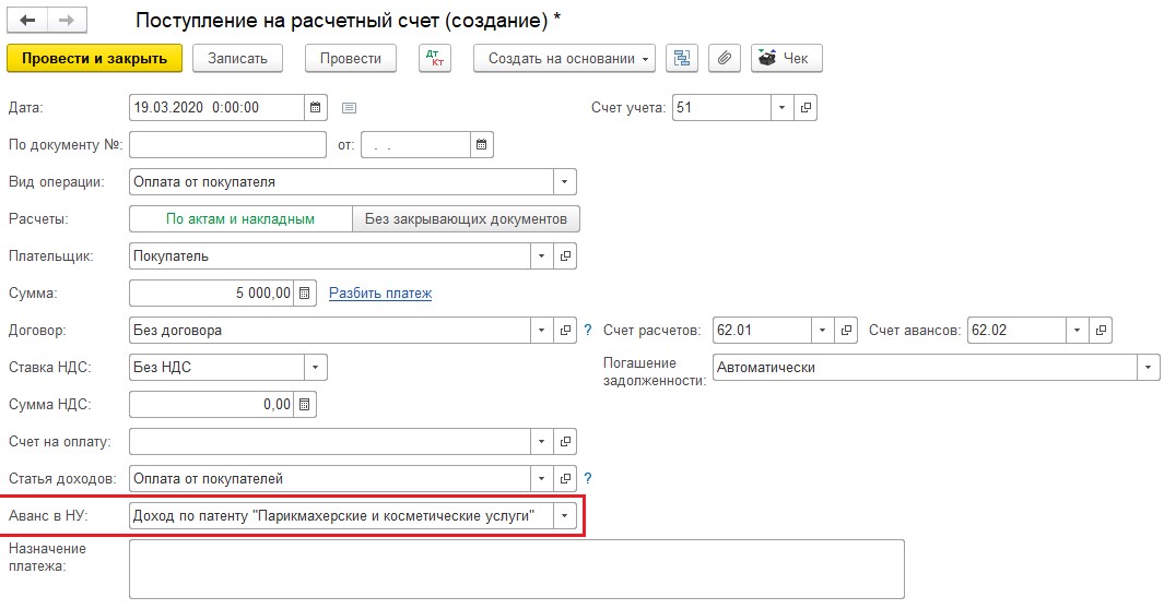 При вводе определенных операций, к примеру, при вводе документации «Поступление на РС» в разделе «Банковская организация и касса» - «Выписки из банка» требуется заполнять вид деятельности по патенту для учёта доходности.