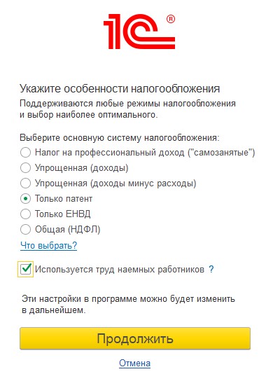 После нажатия на клавишу «Продолжить» вы перейдёте ко 2 этапу настройки – выбору системы налогового обложения. Здесь необходимо помощью флага отметить пункт «Только патент» и указать, если ли у вас работники по найму. Если ПСН не считается вашей единственной системой налогового обложения, и вы совмещаете её с другим режимом, то в настройке стоит выбрать иную систему, а в будущем, при настройке учётной политики пометить флажком патент.