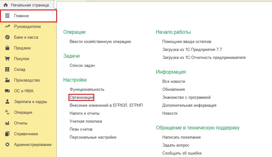 Затем нажмите на клавишу «Продолжить» и вы попадете в стандартный интерфейс программного продукта. Далее вам придется заполнить реквизиты ИП в справочнике «Организации», который находится во вкладке «Главное».