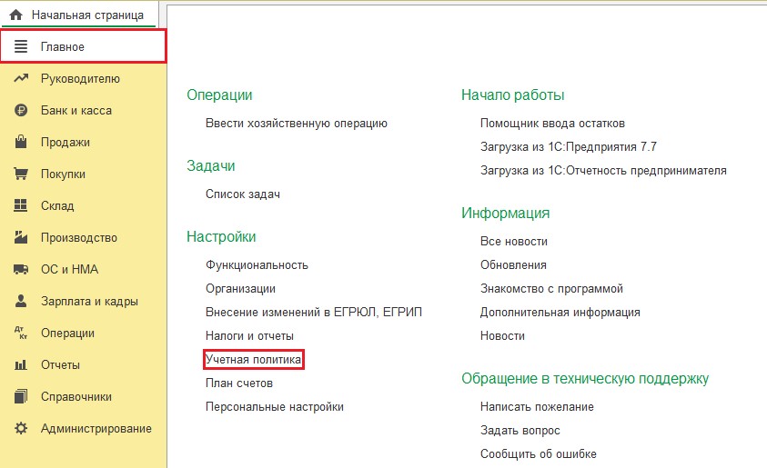 Прежде чем переходить к полноценной деятельности и вводу документации по предпринимательской деятельности, стоит заполнить учётную политику. Открыть её можно во вкладке «Главное», нажав на вкладку «Учётного типа политика».