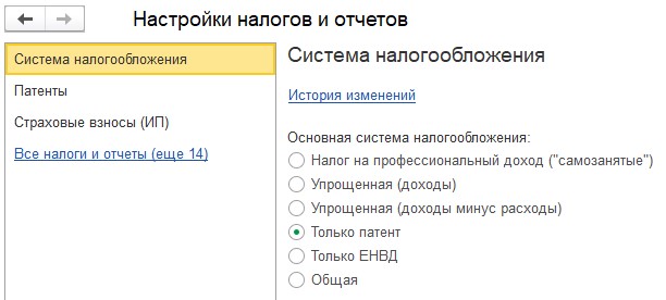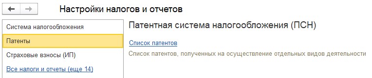 Снова перейдем к настройке налогов и отчетности, закрыв окошко со списком патентов.