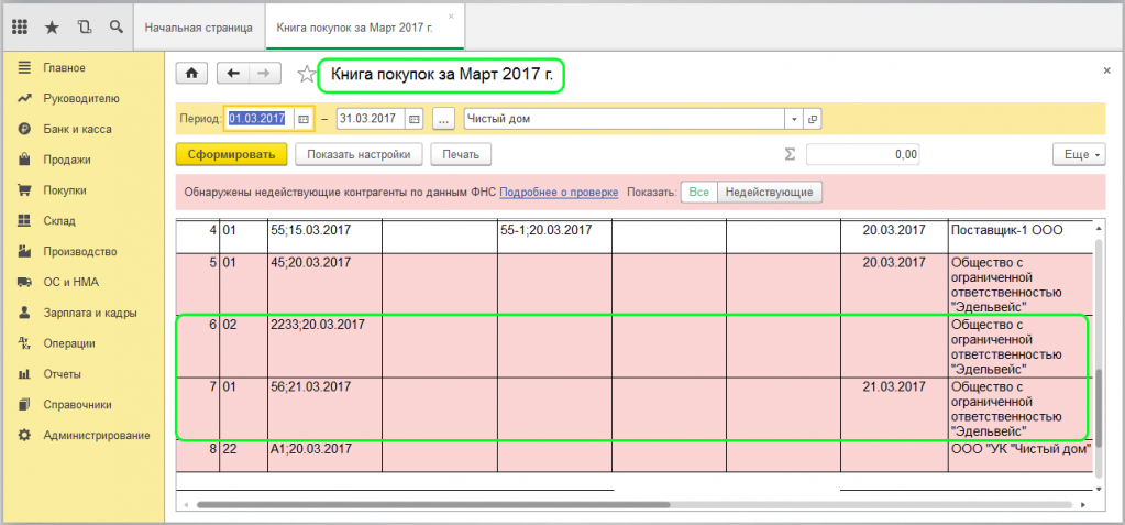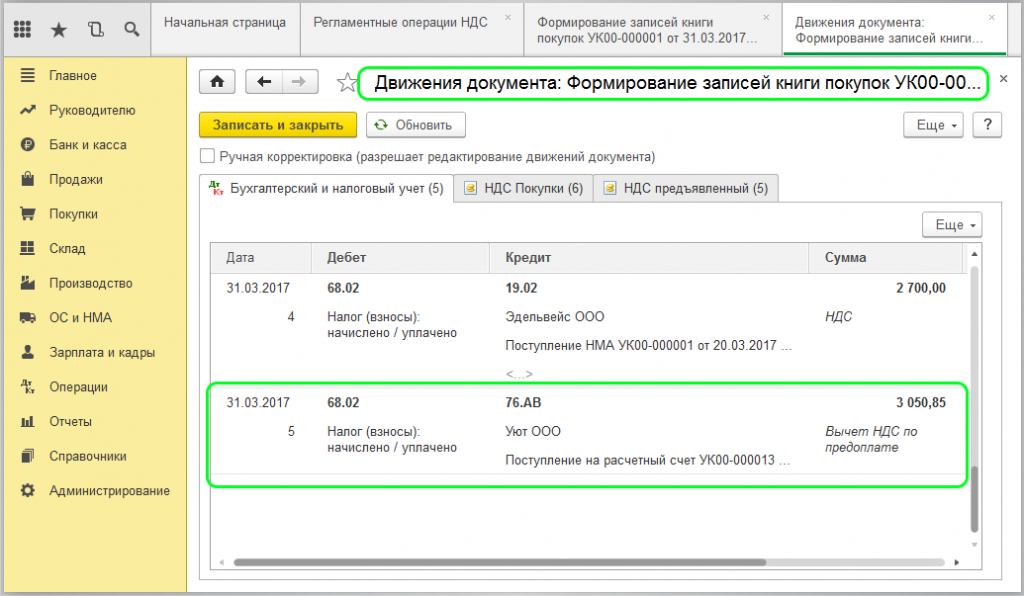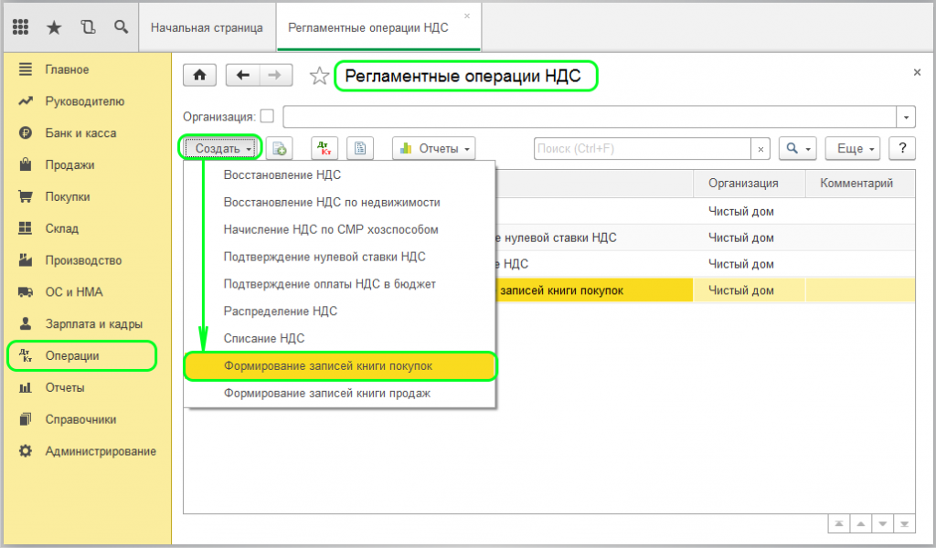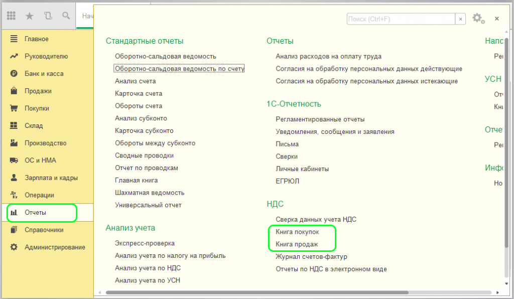 Итоги по регламентным операциям учёта НДС можно посмотреть в выделенных на картинке отчётах: