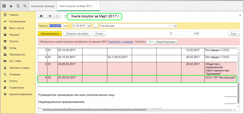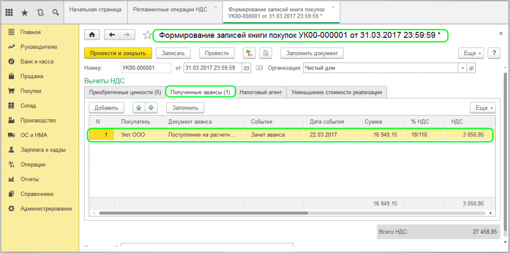 Записи об авансовом платеже и поступлении можно будет увидеть в «Книге покупок»: