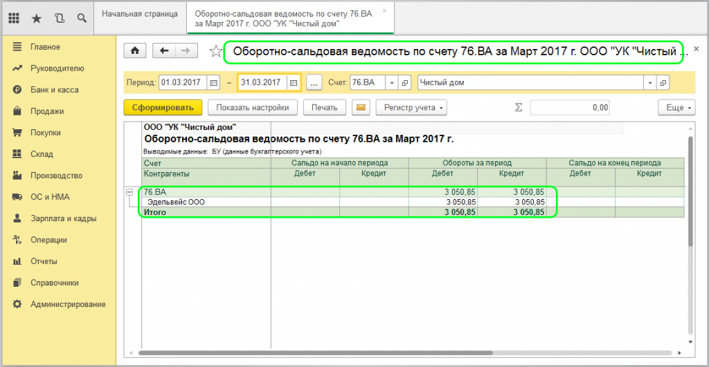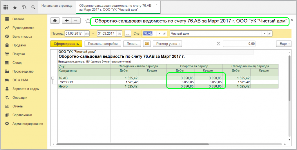 В записях должна фигурировать одинаковая сумма, то есть оплата НДС в бюджет одноразовая. Проверить закрытие счёта 76.АВ можно, создав отчёт «Оборотно-сальдовая ведомость»: