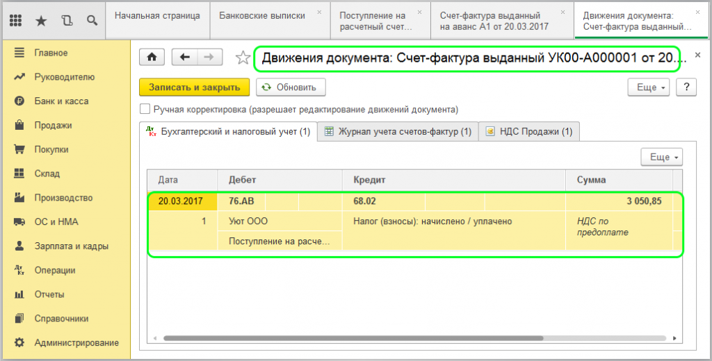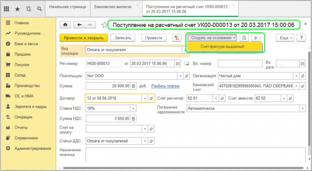 Рассмотрим его создание при поступлении средств на расчётный счёт: