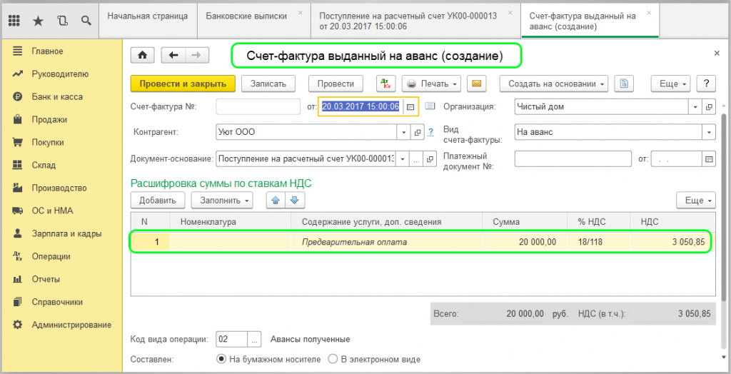 Документ, который формирует проводки по учёту НДС – «Счёт-фактура». Он может быть сформирован: когда на расчётный счёт поступает аванс; при завершении учётного периода (месяца).