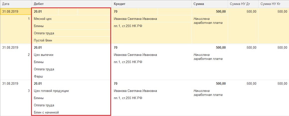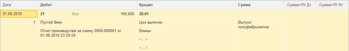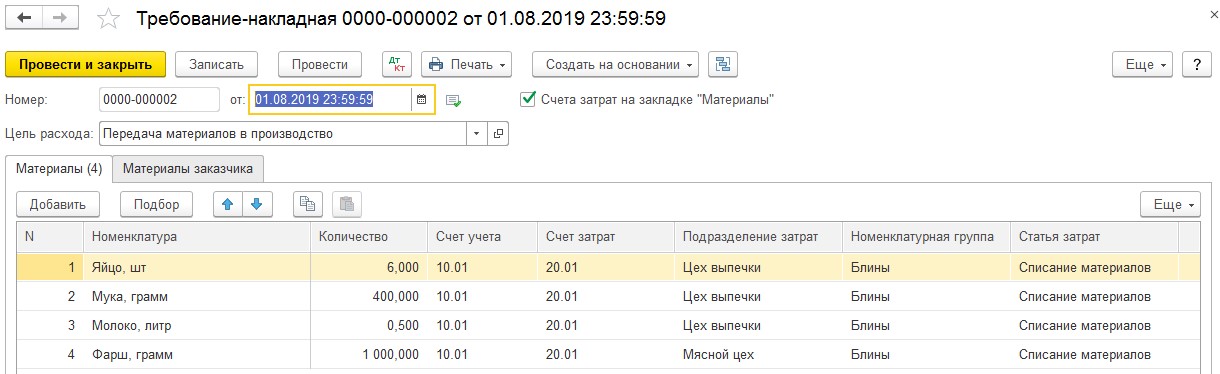 Рассмотрим пример: организация осуществляет изготовление фарша и блинчиков (полуфабрикатов) и готовит мясные блины. По всем вариантам применяемых продуктов оформленный документ сформирует проводки Дт 20.01 Кт 10.01.