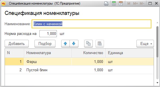 Теперь кликайте на «Создать», предварительно нажав на «Специализация». Укажите нужные для изготовления товара полуфабрикаты. Предположим, Блин с начинкой 1 единица из одной порции фарша и одного пустого блинчика.
