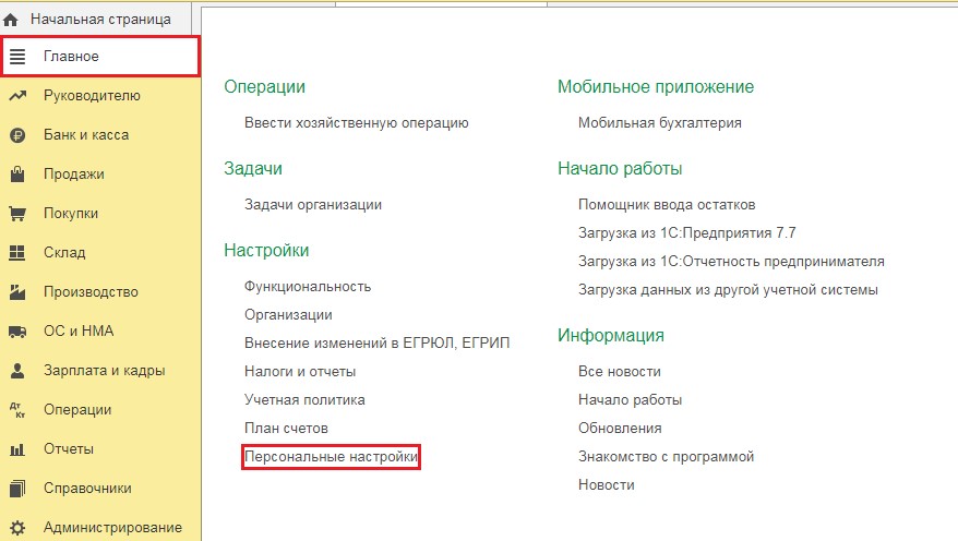 В программе 1С: Бухгалтерия предприятия необходимо перейти в «Главное». Затем в этом разделе выбрать «Персональные настройки».