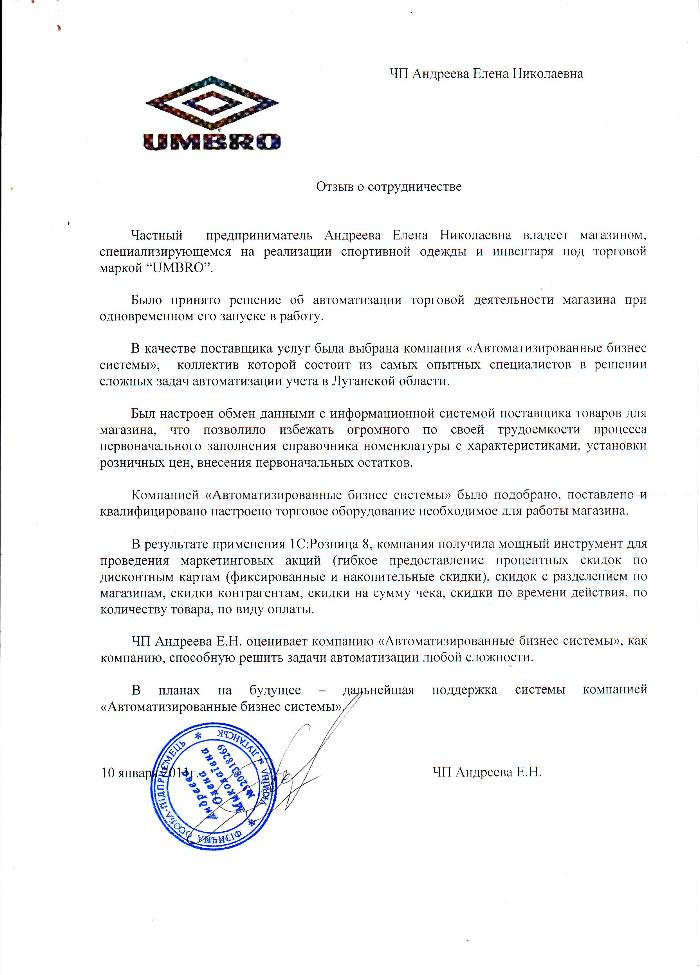 Специалисты компании "1С:Бухучет и Торговля" (БИТ) завершили первый этап проекта по автоматизации розничного учета в торговых точках сети спортивных товаров компании "АВМ СПОРТ" – официального представителя UMBRO.